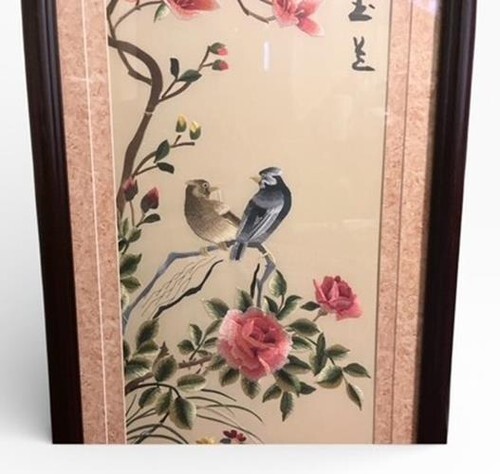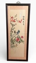 Elegant vintage Asian-style wall art panel featuring birds and flowering branches, presented in a tall, narrow format with a dark wood frame. A beautiful accent piece for traditional, chinoiserie, or zen-inspired interiors.