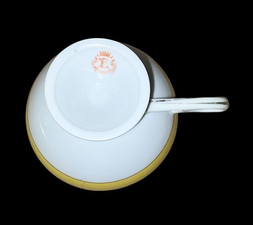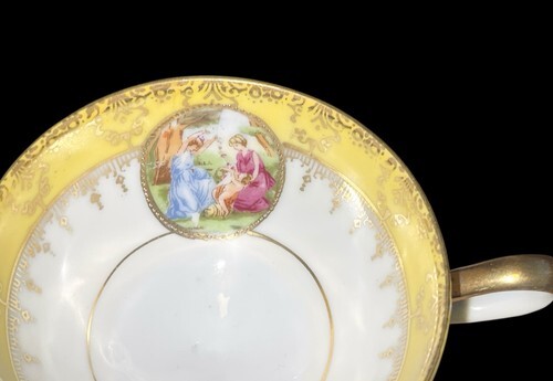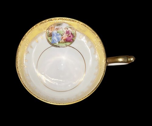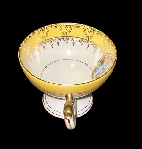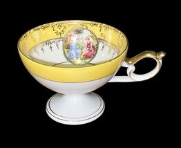 This is a stunning vintage E&R Golden Crown Bavarian porcelain pedestal cup featuring a yellow and white body with ornate gold detailing and a classical romantic scene medallion inside the bowl. It stands approximately 2.75" tall with a 3.5" top diameter. The handle and rim feature gold trim, and the footed base gives it an elegant profile. No chips or cracks. Some light wear to the gold consistent with age. Please see all photos for condition.