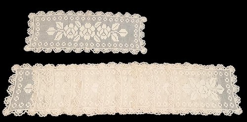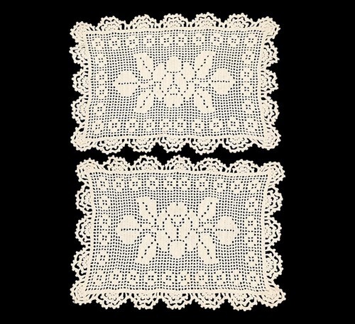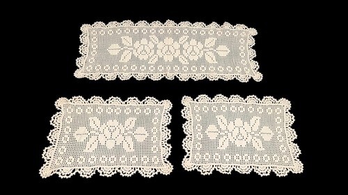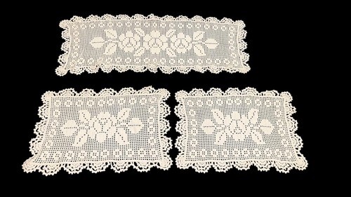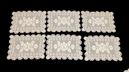 Beautiful vintage handmade crochet lace set featuring 10 rectangular placemats and one matching table runner. Each piece is intricately crafted with a floral motif and scalloped edges — perfect for an elegant, classic table display or vintage-inspired home décor.