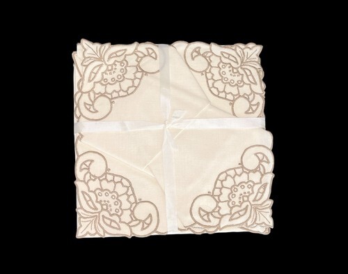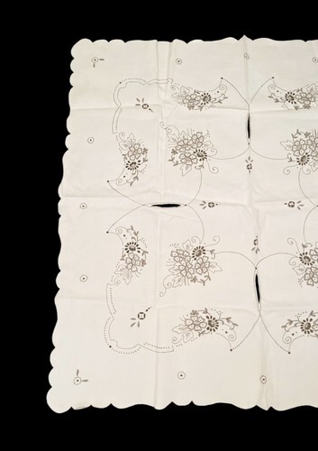 Elegant vintage handmade embroidered square tablecloth set with beautiful floral cutwork and scalloped edges. This charming set includes eight matching napkins, all unused and still neatly tied with ribbon. Perfect for adding a touch of vintage charm to any dining setting or display.
