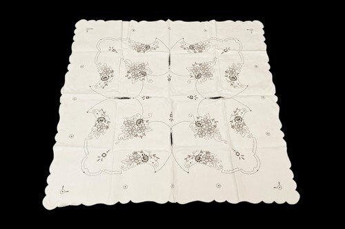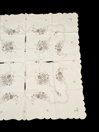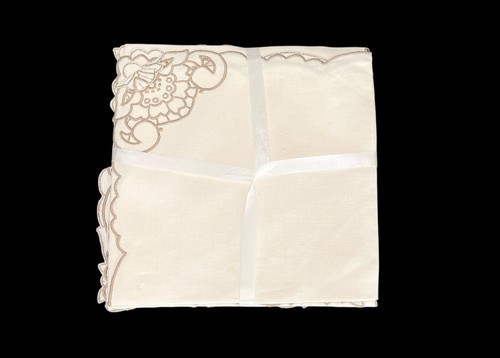 Elegant vintage handmade embroidered square tablecloth set with beautiful floral cutwork and scalloped edges. This charming set includes eight matching napkins, all unused and still neatly tied with ribbon. Perfect for adding a touch of vintage charm to any dining setting or display.