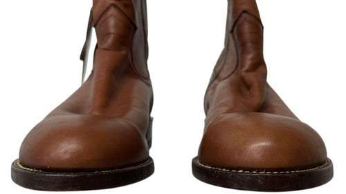 Boots are new and unworn. There is a small dark spot/discoloration on the leather (shown in photos), likely from storage. Does not affect wear.