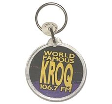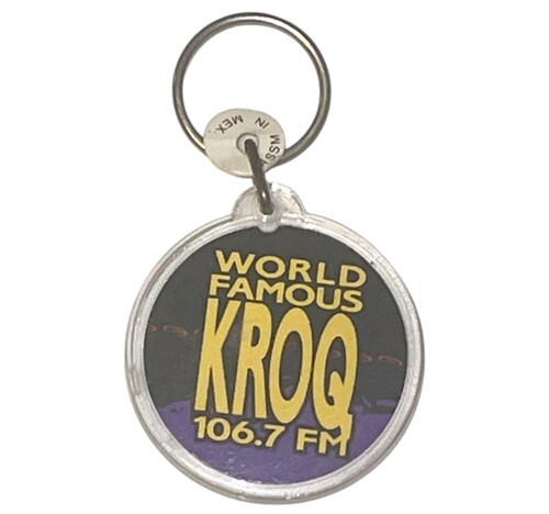 This vintage KROQ 106.7 FM keychain features the iconic “World Famous KROQ” logo in bold yellow text over a black and purple background. A classic collectible from one of Los Angeles’ most legendary alternative rock radio stations, known for bands like Nirvana, Red Hot Chili Peppers, and The Cure.