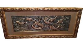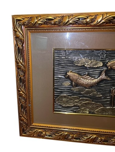 Vintage framed wall art featuring a raised koi fish relief scene with lily pads in a tranquil water setting. The sculptural metal-style panel has excellent dimensional detail and is set in an ornate gold-tone frame with a wide neutral mat. This piece has strong Asian / chinoiserie design influence and makes a striking statement for a living room, entryway, or office.