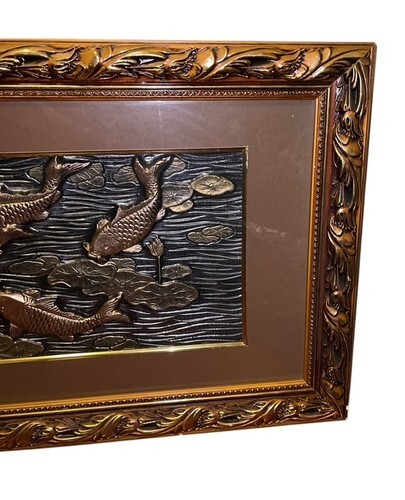 Vintage framed wall art featuring a raised koi fish relief scene with lily pads in a tranquil water setting. The sculptural metal-style panel has excellent dimensional detail and is set in an ornate gold-tone frame with a wide neutral mat. This piece has strong Asian / chinoiserie design influence and makes a striking statement for a living room, entryway, or office.