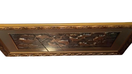 Materials appear to be mixed media (metal relief panel with framed backing)