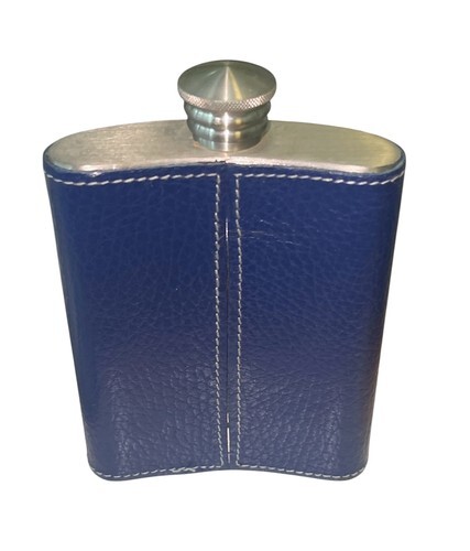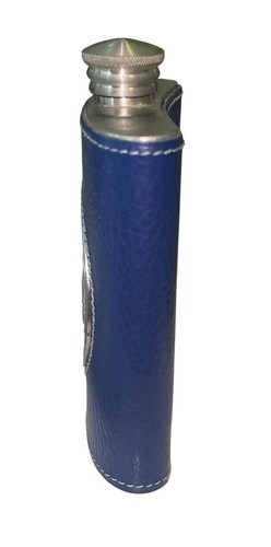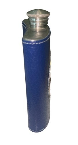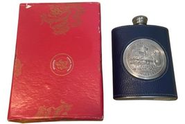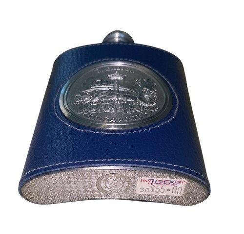 Unused souvenir hip flask from Singapore. Features Merlion and Changi Tower design with blue leather wrap. Made by Dragon Pewter. Includes original box. Measures 5" x 4". Over 20 years old.