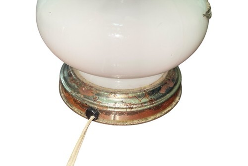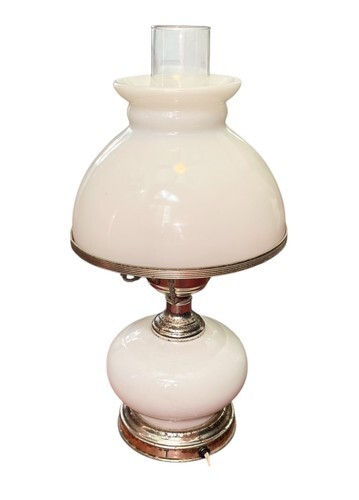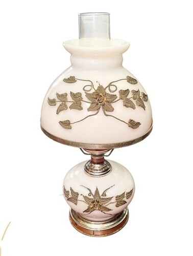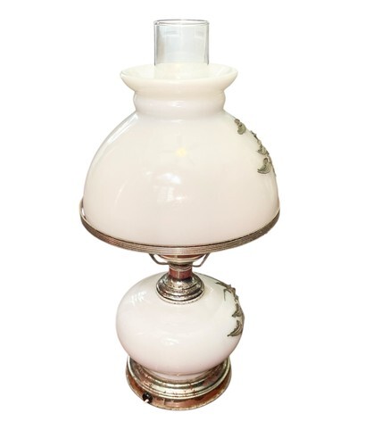Beautiful vintage milk glass hurricane table lamp featuring elegant raised floral detailing and a brass-tone metal base. This classic lamp has a timeless Victorian / traditional look and provides a warm, ambient glow when lit.