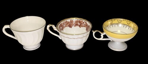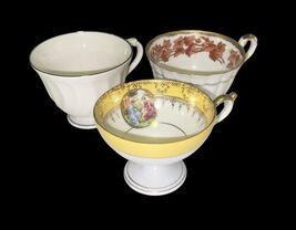 Lot of 3 Vintage Porcelain Footed Teacups — an elegant mixed collection featuring three distinct and beautifully detailed designs, perfect for collectors or display.