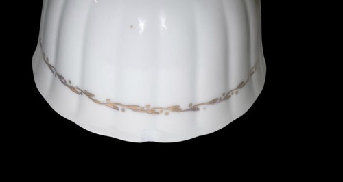 Warm brown leaf pattern inside rim, gold trim on handle and foot