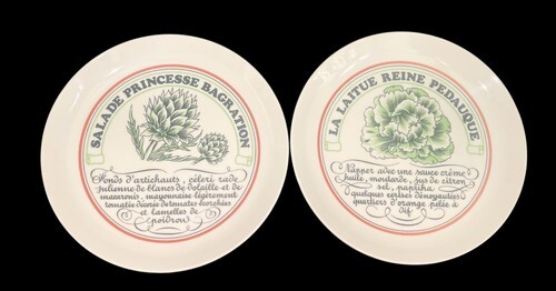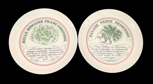 This is a charming vintage set of 6 salad plates by Toscany, made in Japan. Each 7.5" plate features a unique illustrated French salad recipe including: