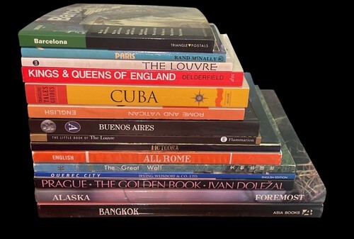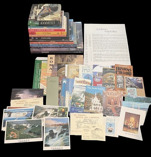 Large lot of 30+ vintage travel items including guidebooks, postcards, brochures, and handwritten travel journal pages. Features destinations like Rome, Prague, Paris, Iguazú Falls, Alaska, Quebec City, and more. Great for collectors or décor.