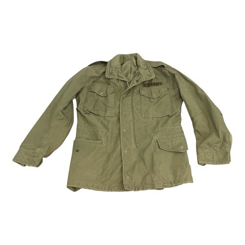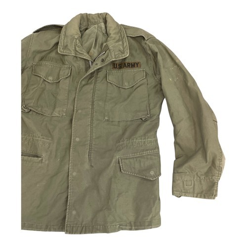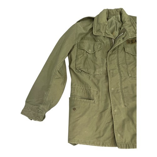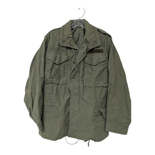 This is a vintage U.S. Army M-65 Field Jacket in classic olive green (OG-107), ideal for collectors or fans of authentic military wear. Constructed from durable cotton-blend material and designed for cold weather conditions, it features: