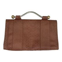 This vintage Zambos & Siega clutch bag features a striking brown faux snakeskin texture and a polished silver-tone curved handle with gold-tone ball ends. It has a structured design, magnetic flap closure, and a light fabric interior with one zip pocket.