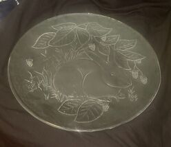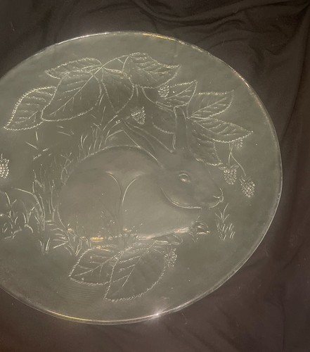 This vintage clear glass plate features a beautifully etched design of a rabbit nestled among grass, leaves, and berries. Measuring 13 inches in diameter, it's a charming piece perfect for display or use as a decorative serving platter. The detailed craftsmanship makes it a lovely addition to any rustic, woodland, or animal-themed decor. Excellent condition with no chips or cracks.