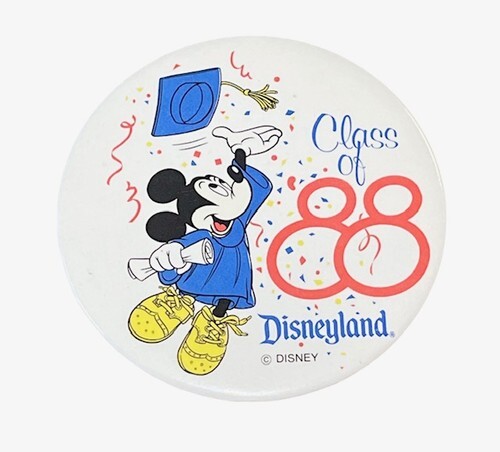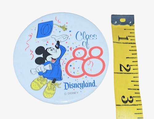Vintage Disneyland “Class of ’88” pinback button featuring Mickey Mouse in graduation attire holding a diploma. A fun collectible piece of Disney memorabilia.