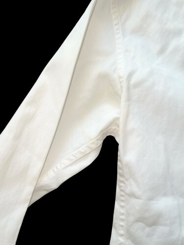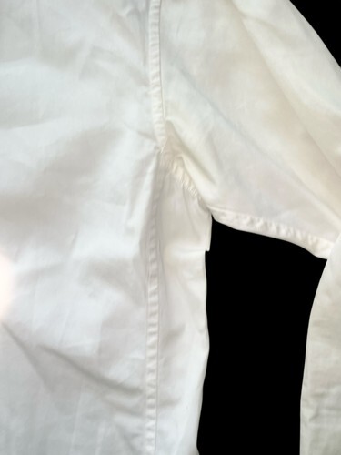 Pre-owned; shows signs of wear. There is visible yellowing on the underarms and some light discoloration on other areas (see photos). No holes, rips, or missing buttons.