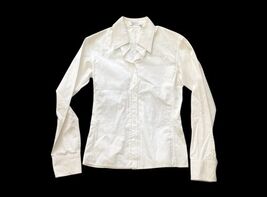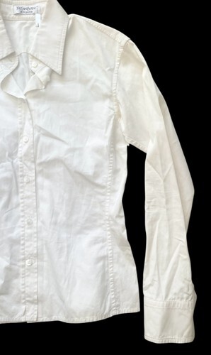 Classic Yves Saint Laurent Rive Gauche women’s white button-down shirt, made in Italy from 100% cotton. This beautifully tailored piece features a pointed collar, long sleeves with button cuffs, and a slim, structured silhouette — an elegant staple from one of fashion’s most iconic Parisian houses.